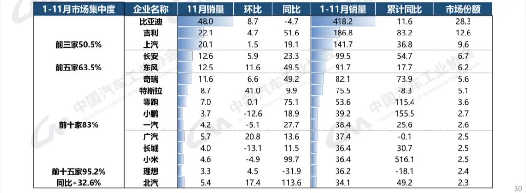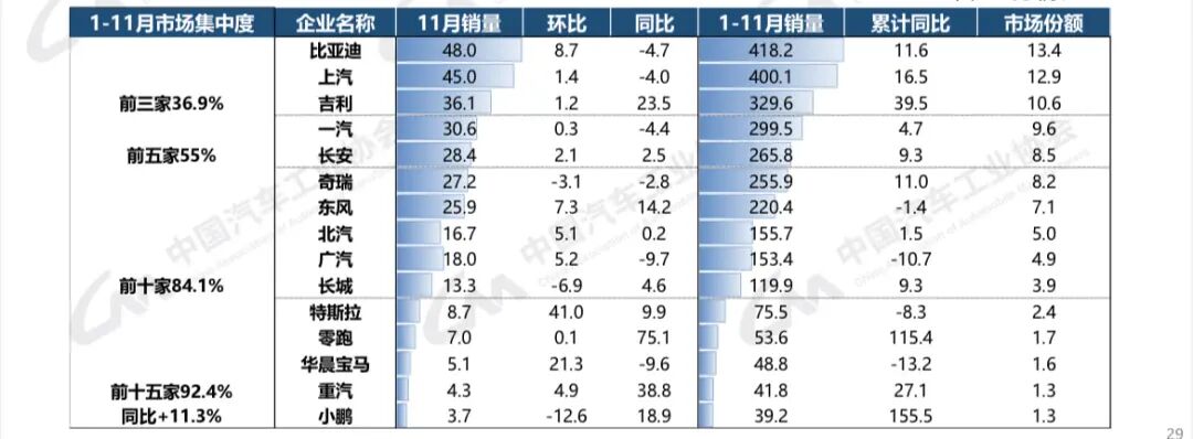 在企业集中度方面,1—11月,中国新能源汽车销量排名前十五位的集团销量合计为1407.2万辆,同比增长32.6%,占新能源汽车销售总量的95.2%,高于2024年同期1个百分点。
