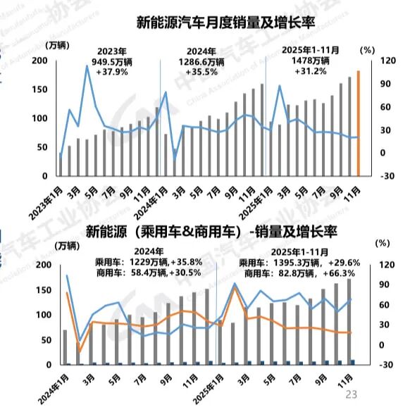 新能源汽车方面,中汽协数据显示,2025年1至11月,中国新能源汽车产销量均接近1500万辆,同比增长均超过30%。出口方面,新能源汽车出口231.5万辆,同比增长超过100%。