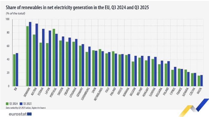 欧盟委员会数据显示,2025年第三季度,欧盟净发电量中有49.3%来自可再生能源,较2024年同期的47.5%增长了3.8%。在欧盟国家中,2025年第三季度,丹麦以95.9%的可再生能源在净发电中的比例最高,其次是奥地利(93.3%)和爱沙尼亚(85.6%)。可再生能源比例最低的国家分别是马耳他(16.6%)、捷克(19.7%)和斯洛伐克(21.1%)。