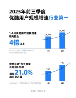 上证报中国证券网讯(记者杨翔菲)12月11日,艾瑞咨询发布《2025年Q3中国移动互联网流量季度报告》。报告显示,得益于多元内容布局和精细化运营,1月至9月期间,优酷用户规模增速位居长视频平台榜首,实现用户规模与黏性双增长;第三季度,优酷月均广告主数量超200家,较年初上涨21%,增幅位列行业第一,精品内容带动效应日趋显著。