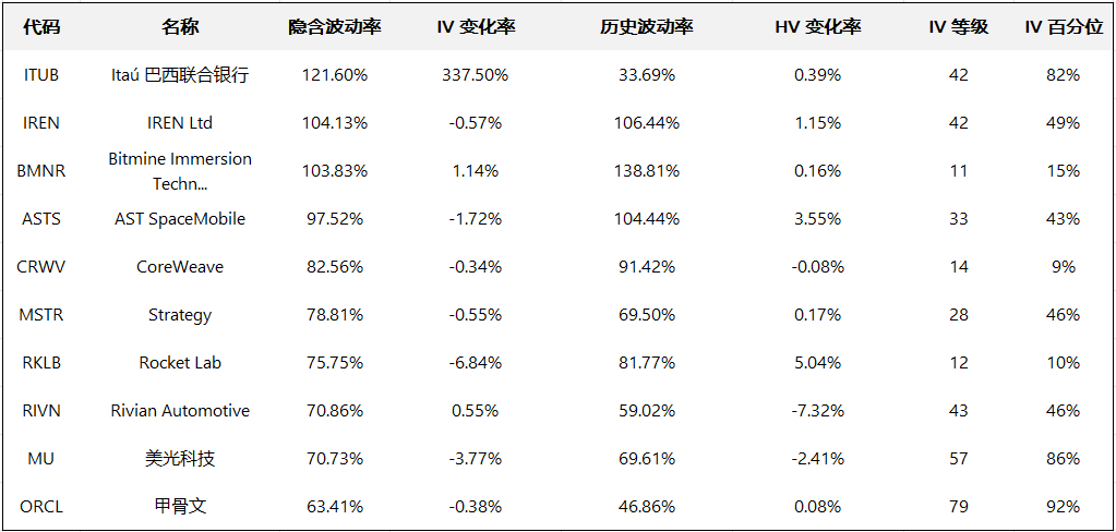美股期权波动率排行榜前十(标的市值>100亿美元,且期权成交量>10万张)