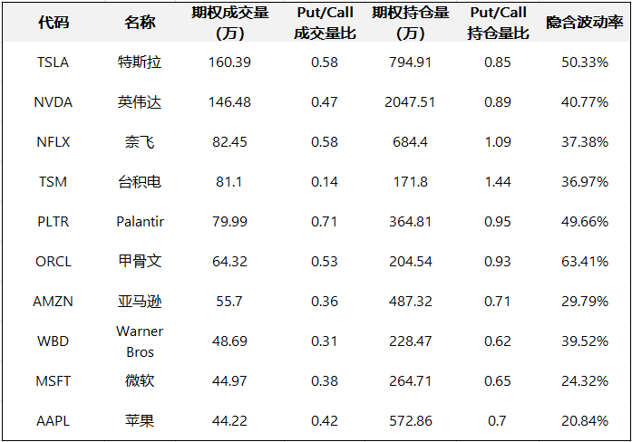2、奈飞上一交易日跌4.14%,前一日认沽/认购比例略有上行,成交量大幅度上行。