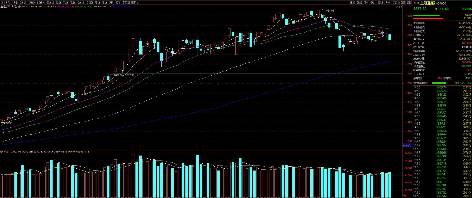 截至收盘,上证指数报收3873.32点,下跌0.7%;深证成指报收13147.39点,下跌1.27%;创业板指报收3163.67点,下跌1.41%。两市成交量在连续缩量数日后,开始重新放大。