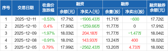 中国化学:融资净偿还1906.43万元,融资余额17.71亿元(12-11)