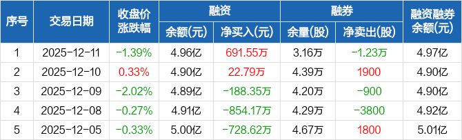 融资方面,当日融资买入1553.6万元,融资偿还862.05万元,融资净买入691.55万元。融券方面,融券卖出200股,融券偿还1.25万股,融券余量3.16万股,融券余额56.22万元。融资融券余额合计4.97亿元。