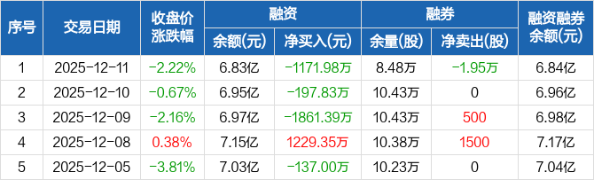 融资方面,当日融资买入2174.41万元,融资偿还3346.39万元,融资净偿还1171.98万元,连续3日净偿还累计3231.2万元。融券方面,融券卖出500股,融券偿还2万股,融券余量8.48万股,融券余额85.82万元。融资融券余额合计6.84亿元。
