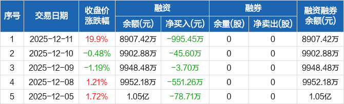 融资方面,当日融资买入3660.32万元,融资偿还4655.77万元,融资净偿还995.45万元,连续7日净偿还累计2183.66万元。融券方面,融券卖出0股,融券偿还0股,融券余量0股,融券余额0元。融资融券余额合计8907.42万元。