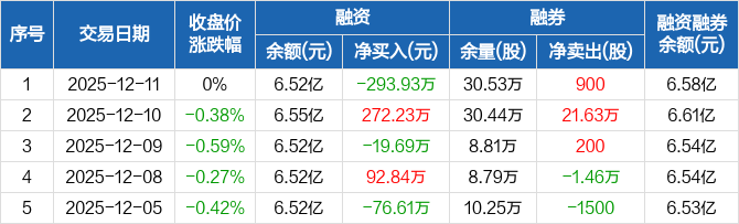融资方面,当日融资买入791.06万元,融资偿还1085万元,融资净偿还293.93万元。融券方面,融券卖出900股,融券偿还0股,融券余量30.53万股,融券余额566.72万元。融资融券余额合计6.58亿元。