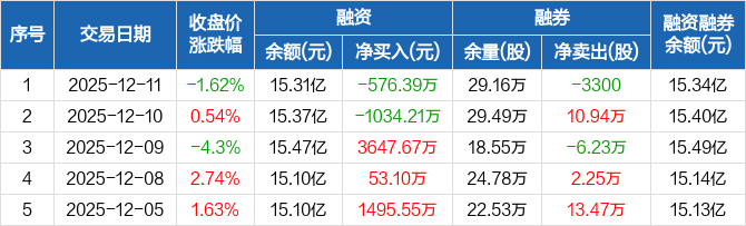 融资方面,当日融资买入2841.67万元,融资偿还3418.06万元,融资净偿还576.39万元。融券方面,融券卖出3.49万股,融券偿还3.82万股,融券余量29.16万股,融券余额372.08万元。融资融券余额合计15.34亿元。