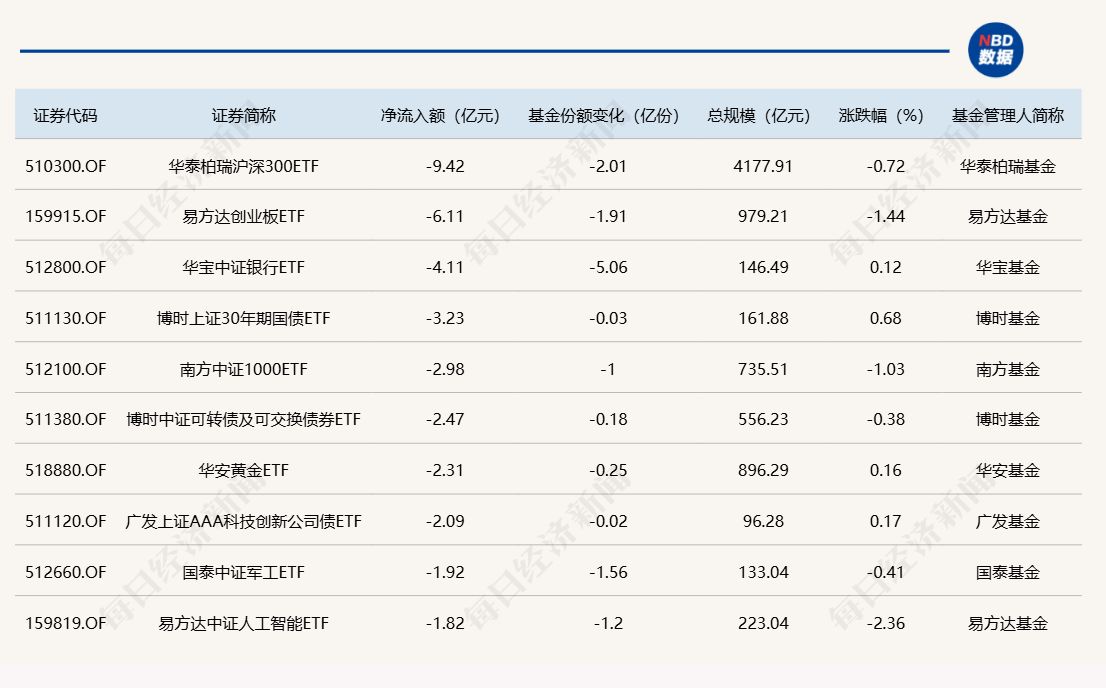 与此同时,华泰柏瑞沪深300ETF份额减少2.01亿份,对应净流出9.42亿元;易方达创业板ETF份额减少1.91亿份,录得净流出6.11亿元;华宝中证银行ETF份额减少5.06亿份,出现净流出4.11亿元。