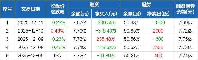 融资方面,当日融资买入1228.51万元,融资偿还1578.07万元,融资净偿还349.56万元。融券方面,融券卖出0股,融券偿还3700股,融券余量50.48万股,融券余额219.08万元。融资融券余额合计7.69亿元。