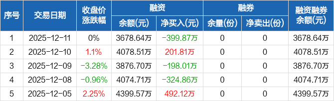 黄金股ETF:融资净偿还399.87万元,融资余额3678.64万元(12-11)
