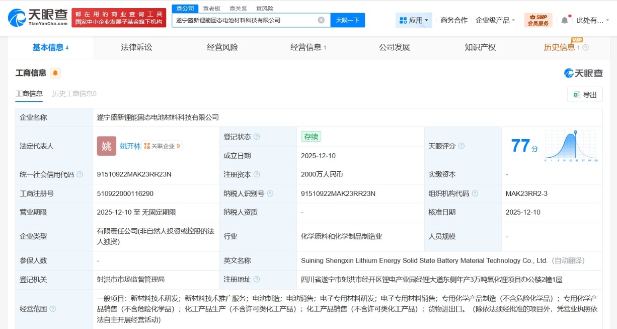 南方财经12月12日电,天眼查工商信息显示,近日,遂宁盛新锂能固态电池材料科技有限公司成立,法定代表人为姚开林,注册资本2000万人民币,经营范围含新材料技术研发、新材料技术推广服务、电池制造、电池销售、电子专用材料研发、电子专用材料销售、专用化学产品制造等。股东信息显示,该公司由盛新锂能(002240)全资持股。
