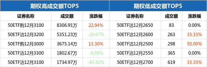 从成交额来看,50ETF期权合约中,50ETF购12月3100成交额最高,为8306.91万元,全日上涨22.94%,报收0.0477元;而最低的为50ETF沽12月2650,成交额为83元,全日收平,报收0.0003元。