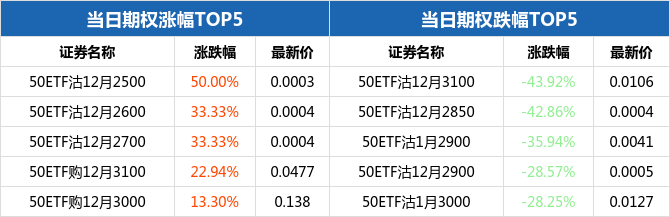 50ETF期权当日有100个合约正在交易。从涨跌幅来看,50ETF期权合约中,50ETF沽12月2500涨幅最大,为50.00%,报收0.0003元;50ETF沽12月3100跌幅最大,为43.92%,报收0.0106元。