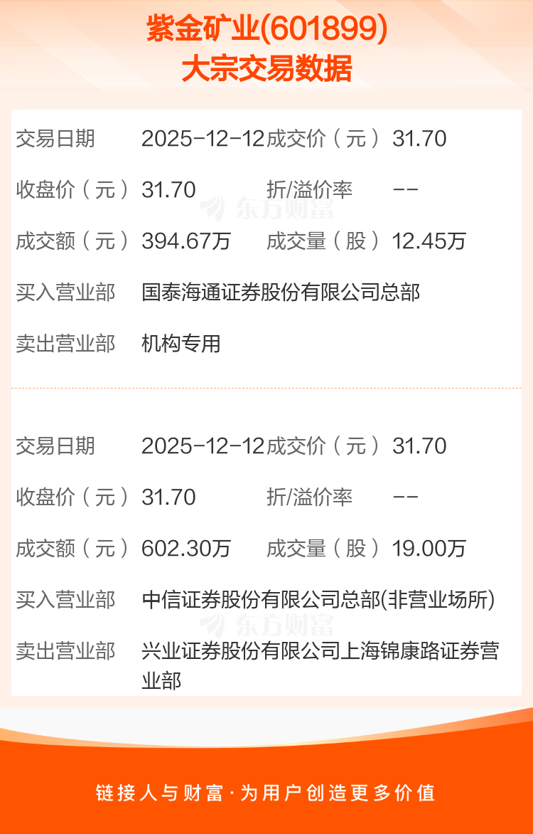 2025年12月12日,紫金矿业发生2笔大宗交易,共成交31.45万股,成交金额996.97万元。