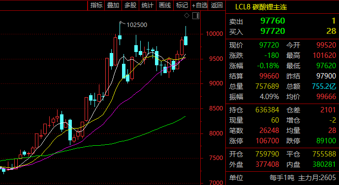12月12日早盘,国内期货市场碳酸锂主力合约2605一度显著上涨,盘中突破10万元关口至101620元/吨,累计三个交易日最大涨幅超过9%。不过午后该主力合约止涨转跌,截至下午收盘报跌0.18%,收于97720元/吨。