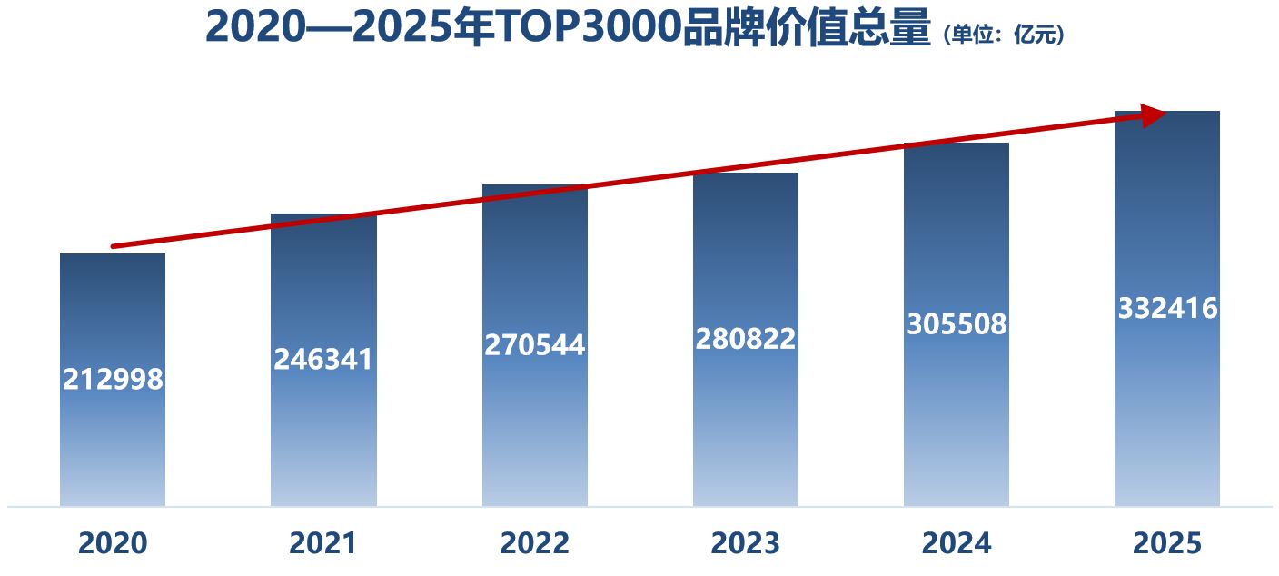 据赵平介绍,从2020年到2025年,蓝皮书TOP3000的品牌价值总量从212998亿元增长到332416亿元,年名义复合增长率为9.3%。