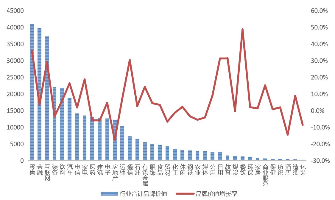 从行业角度来看,在今年的蓝皮书中,全部37个行业都有公司入围。其中,品牌价值最大的3个行业依次是零售、金融和互联网,三者的品牌价值分别为40874亿元、39864亿元和37232亿元。
