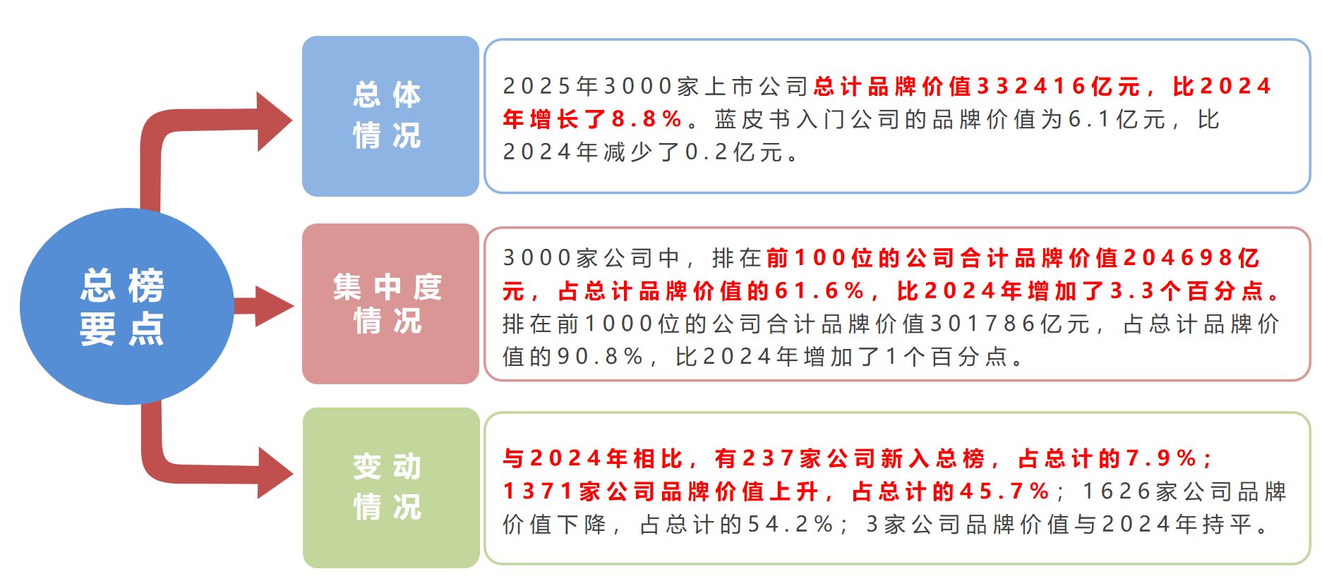 从总体情况看,今年蓝皮书上榜企业的品牌价值持续增长。3000家上市公司总计品牌价值332416亿元,较2024年增长了8.8%。蓝皮书入门公司的品牌价值为6.1亿元,较2024年减少了0.2亿元。