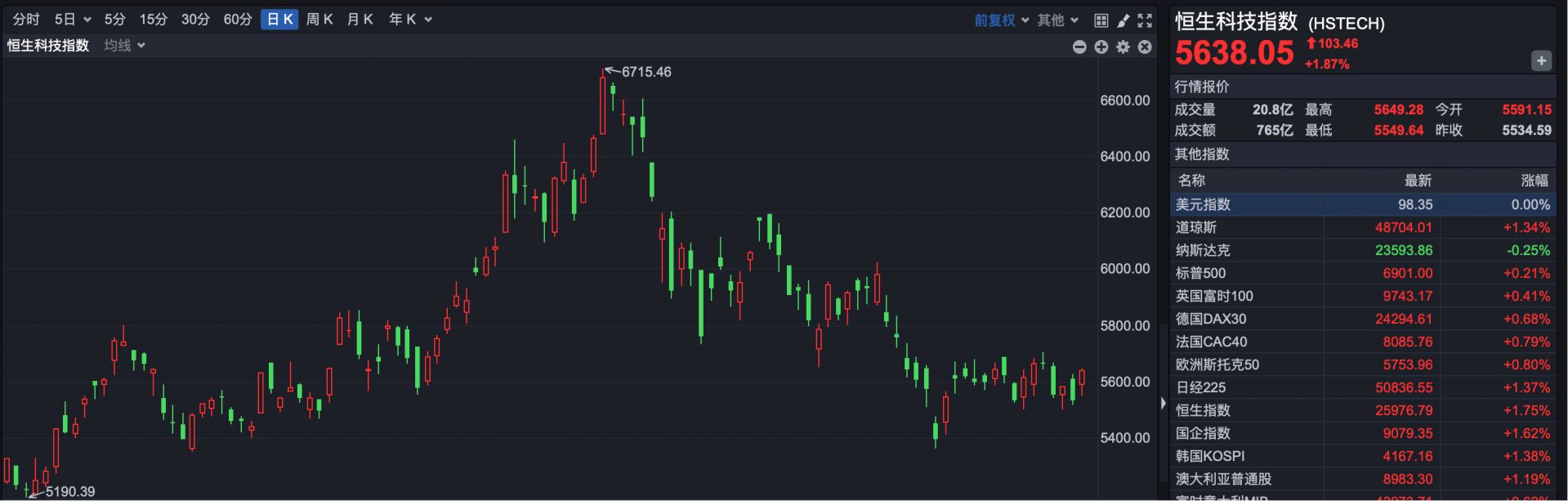 恒生科技指数收报5638.05点,大涨103.46点,涨幅1.87%。