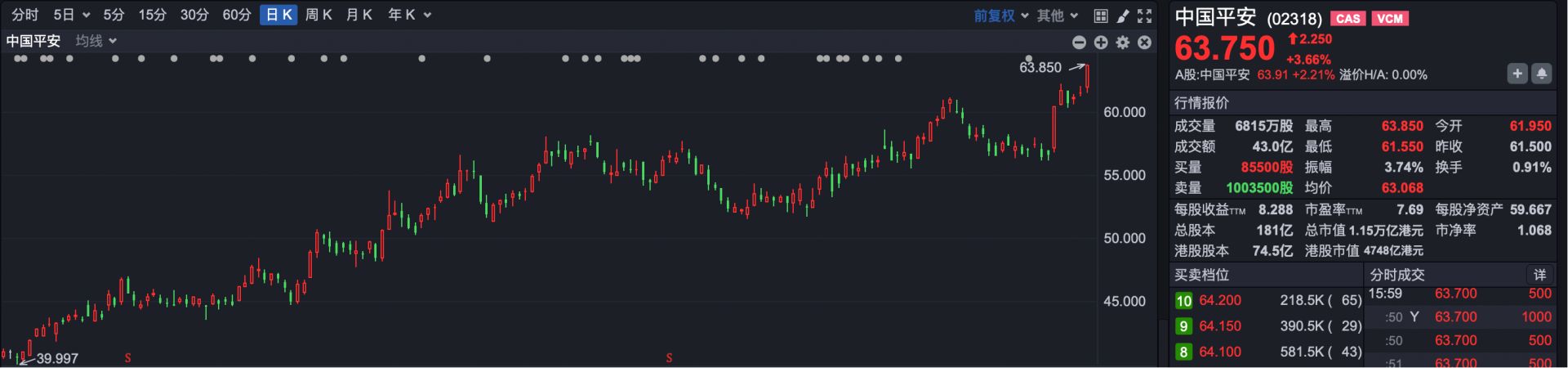 再看今日盘面,对指数起到重要拉升作用的是非银金融板块。其中,保险股整体走强,中国太保(HK02601)、中国人寿(HK02628)涨超5%,中国平安(HK02318)、中国太平(HK00966)涨超3%。其中,中国平安创出2021年7月以来新高。