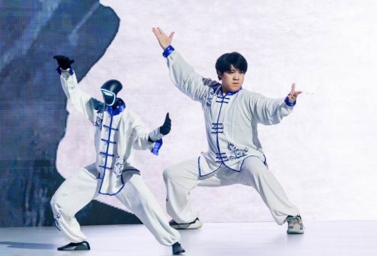 智元远征A2,在11月创下“单次充电行走106公里”吉尼斯世界纪录后,穿上了武生行头打鼓。随着A2的鼓点,舞台中央跃出了两只小巧灵动的身影——智元灵犀X2,它们模拟身披狮被,脚踏梅花桩的舞狮队,随鼓点起舞。待鼓声渐歇,宇树机器人G1登场了。身着白色太极服的宇树G1,与人类武术演员并肩而立。