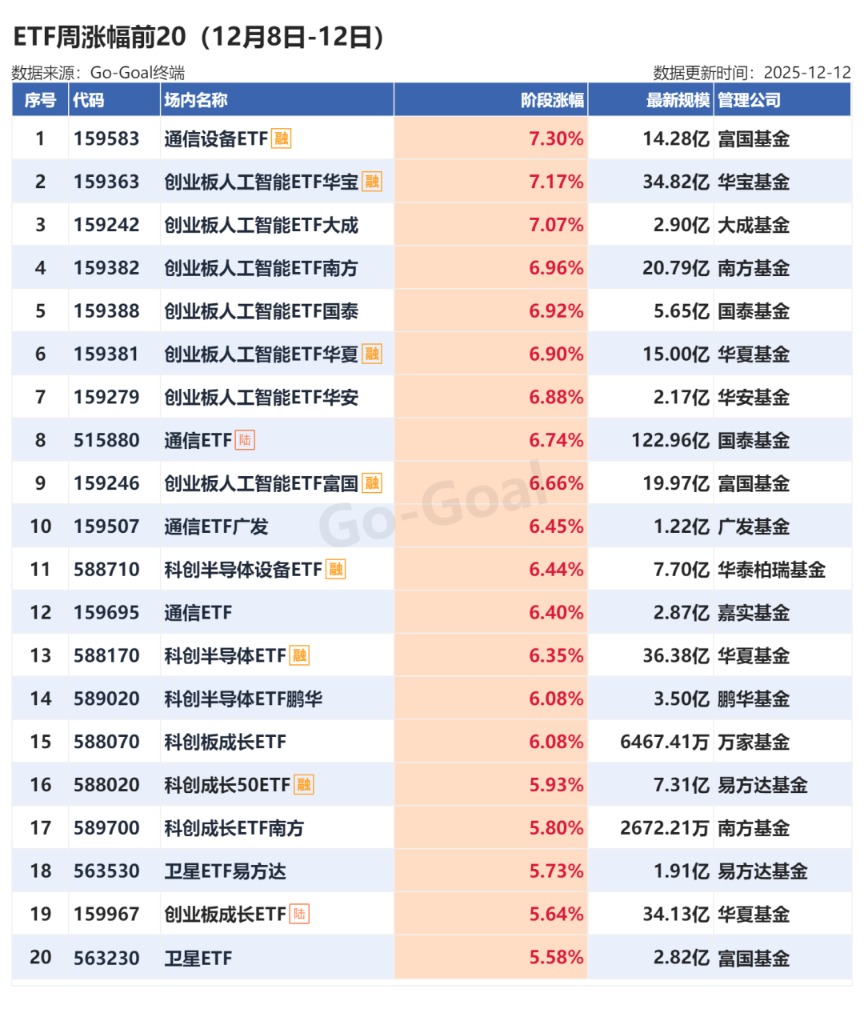 Go-Goal ETF数据显示,本周CPO相关概念仍然是市场亮点,通信设备ETF单周上涨7.3%,涨幅居首。此外,创业板人工智能、科创半导体等相关ETF涨幅居前。跌幅方面,港股红利类ETF调整幅度较前。