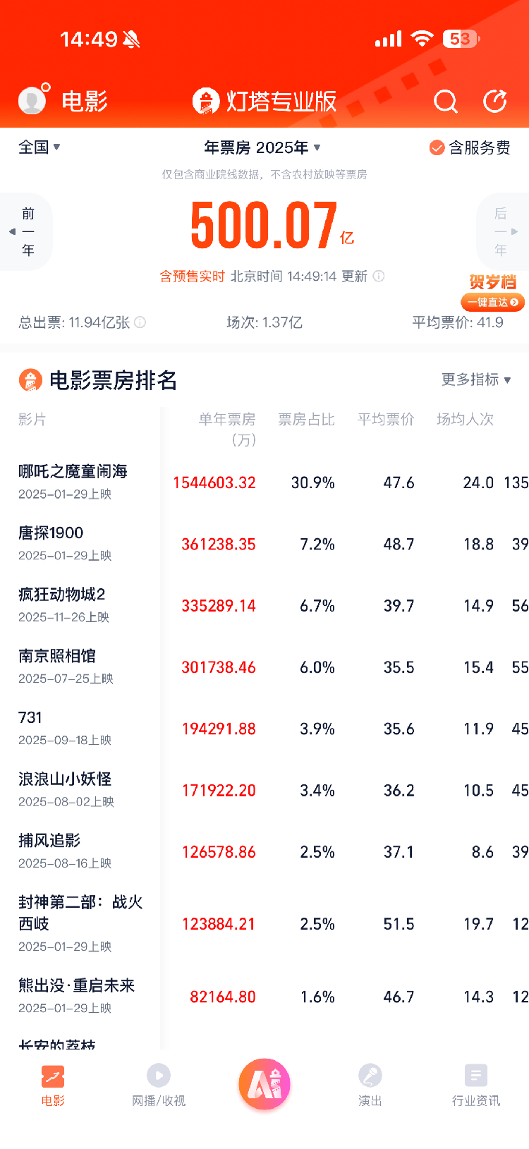 海量财经丨2025年全年总票房破500亿元!平均票价41.9元 低于去年