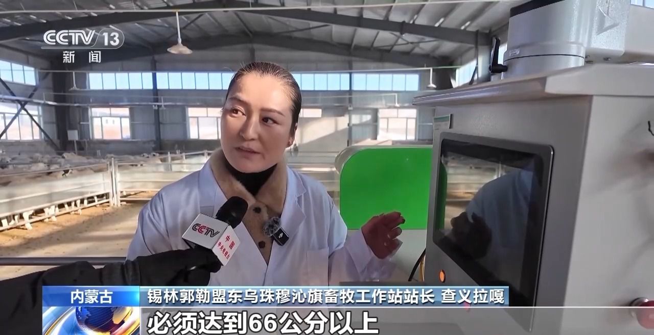 锡林郭勒盟东乌珠穆沁旗畜牧工作站站长查义拉嘎:国家标准是两岁的体高必须达到66厘米以上,胸围是达到90厘米以上,体斜长达到75厘米以上,这样才能测出是不是一个优质的乌珠穆沁羊,不合格的会淘汰掉。