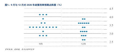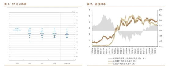 降息幅度符合预期,内部分歧较大。联储连续第三次降息25bp,幅度符合市场预期,其中一人(米兰)继续主张降息50bp,两名票委支持按兵不动,共计三人反对。点阵图预测2026年降息1次,但参考意义有限。本次的点阵图对于2026年的预测中位数仍然落在3.25%-3.5%区间,暗示降息一次,范围相较于9月点阵图保持不变,但可以看到此次点阵图的分布更加平均,印证了联储内部分歧加剧。不过,我们认为此次的点阵图参考意义相对有限,一方面源于巨大的内部分歧;另一方面,明年四名联储票委将迎来轮换。
