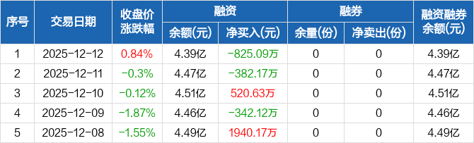 融资方面,当日融资买入9218.95万元,融资偿还1亿元,融资净偿还825.09万元。融券方面,融券卖出0份,融券偿还0份,融券余量0份,融券余额0元。融资融券余额合计4.39亿元。