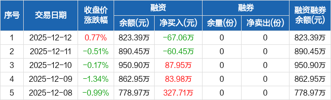 融资方面,当日融资买入32.52万元,融资偿还99.58万元,融资净偿还67.06万元。融券方面,融券卖出0份,融券偿还0份,融券余量0份,融券余额0元。融资融券余额合计823.39万元。