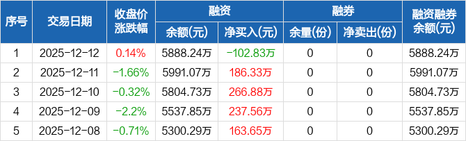 融资方面,当日融资买入531.7万元,融资偿还634.53万元,融资净偿还102.83万元。融券方面,融券卖出0份,融券偿还0份,融券余量0份,融券余额0元。融资融券余额合计5888.24万元。