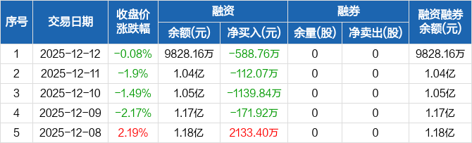 融资方面,当日融资买入465.93万元,融资偿还1054.7万元,融资净偿还588.76万元,连续4日净偿还累计2012.59万元。融券方面,融券卖出0股,融券偿还0股,融券余量0股,融券余额0元。融资融券余额合计9828.16万元。