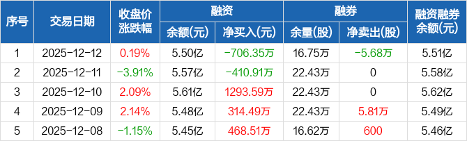 融资方面,当日融资买入564.98万元,融资偿还1271.34万元,融资净偿还706.35万元。融券方面,融券卖出200股,融券偿还5.7万股,融券余量16.75万股,融券余额86.6万元。融资融券余额合计5.51亿元。