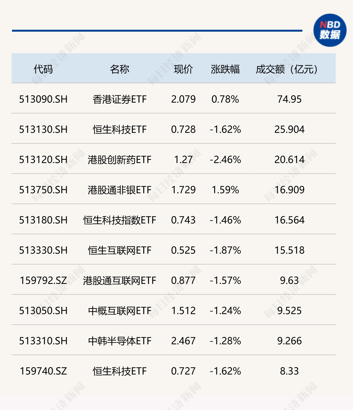 今日早盘,市场震荡调整,科创芯片和证券相关ETF交投活跃。科创芯片ETF、证券ETF半日成交额超14亿元。跨境ETF方面,香港证券ETF半日成交超74亿元。