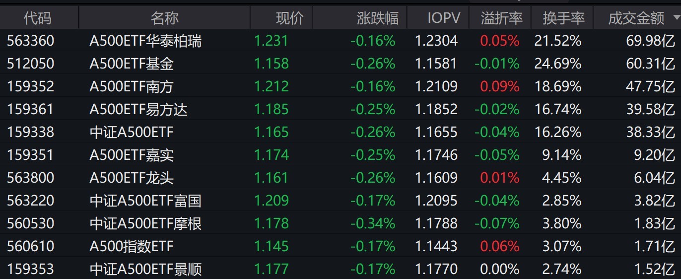 截至上午收盘,场内跟踪中证A500指数的ETF小幅下跌。其中,有11只中证A500相关ETF成交额超1亿元,3只超47亿元。A500ETF华泰柏瑞、A500ETF基金、A500ETF南方早盘成交额分别为69.98亿元、60.31亿元、47.75亿元。