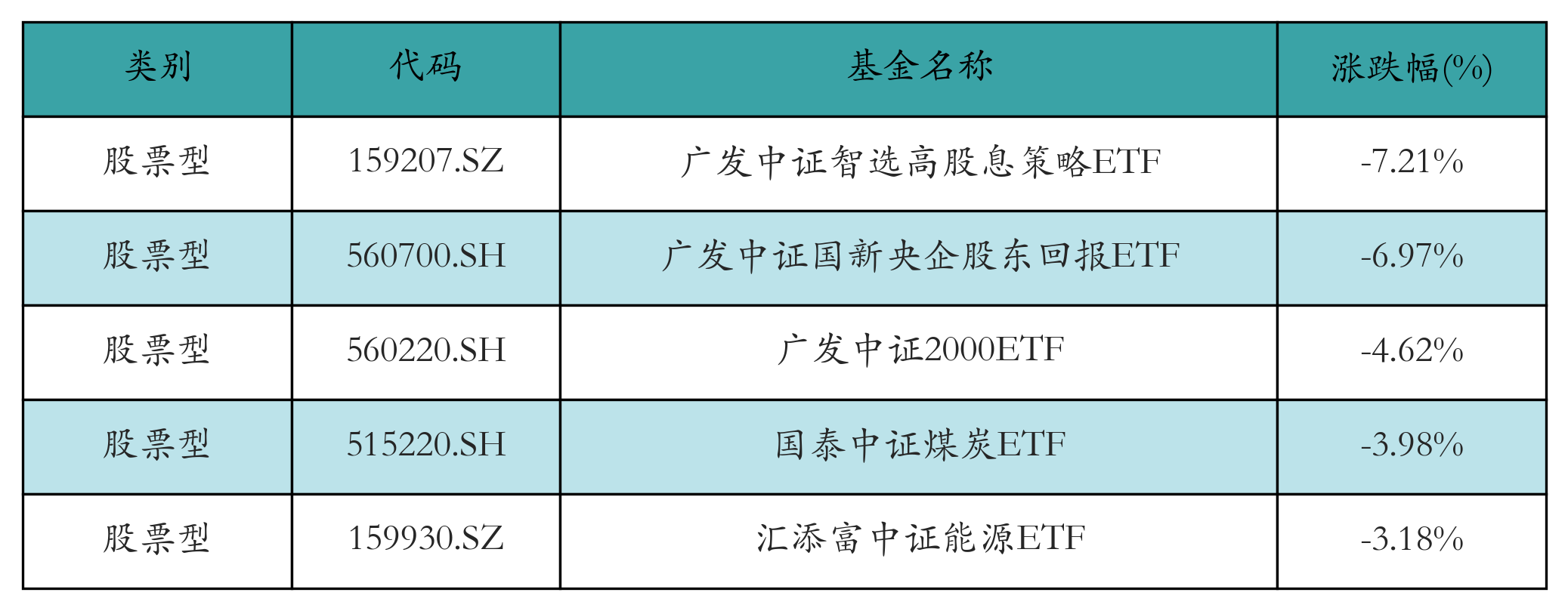 上周股票型ETF跌幅最大的5只ETF及其收益率分别为:广发中证智选高股息策略ETF(-7.21%)、广发中证国新央企股东回报ETF(-6.97%)、广发中证2000ETF(-4.62%)、国泰中证煤炭ETF(-3.98%)、汇添富中证能源ETF(-3.18%)。详情见下表: