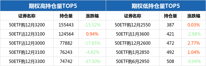 从持仓量来看,50ETF期权合约中,50ETF购12月3200持仓量最大,为155443张,期权全日下跌15.52%,报收0.0049元;持仓量最小的为50ETF购12月2550,共计387张,期权全日上涨0.03%,报收0.585元。