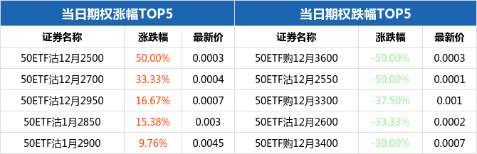 上证上证50ETF收跌,50ETF沽12月2500涨幅50.00%