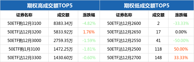 从成交额来看,50ETF期权合约中,50ETF购12月3100成交额最高,为8383.34万元,全日下跌4.82%,报收0.0454元;而最低的为50ETF沽12月2600,成交额为2元,全日下跌33.33%,报收0.0002元。