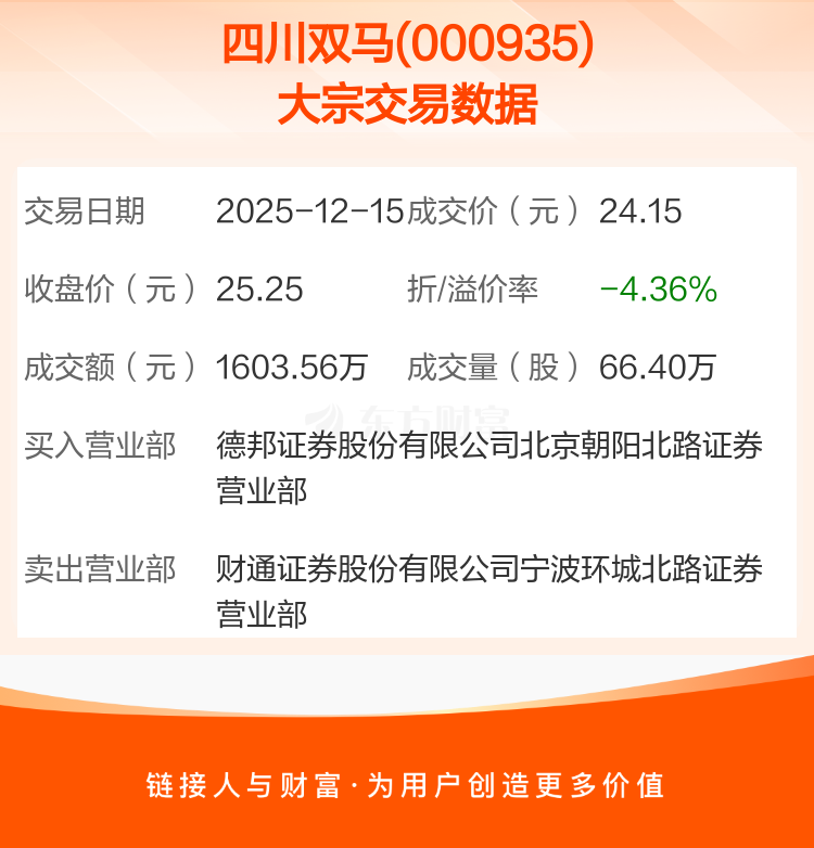 2025年12月15日,四川双马发生1笔大宗交易,共成交66.40万股,成交金额1603.56万元,占其流通市值比例为0.08%。