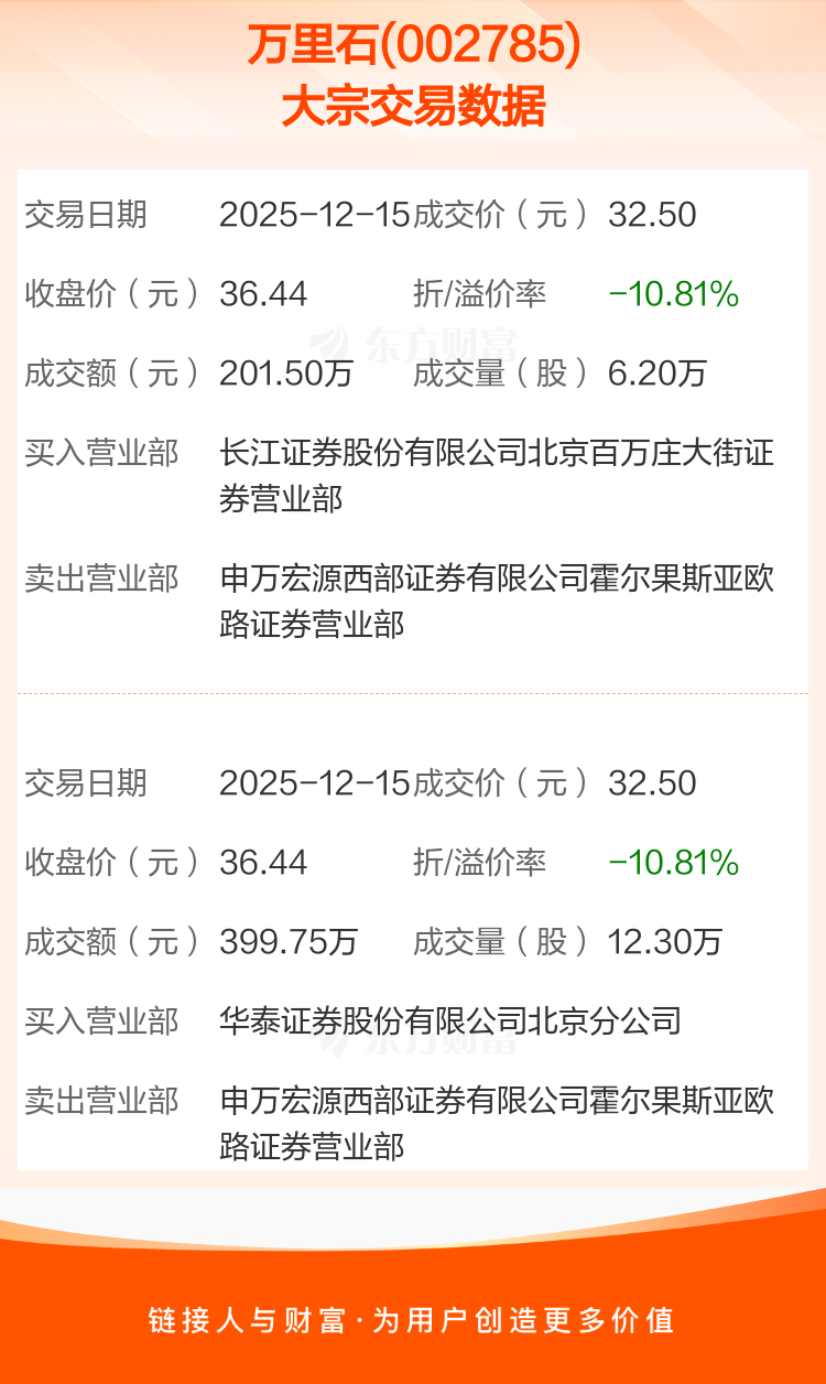 2025年12月15日,万里石发生2笔大宗交易,共成交18.50万股,成交金额601.25万元,占其流通市值比例为0.09%。