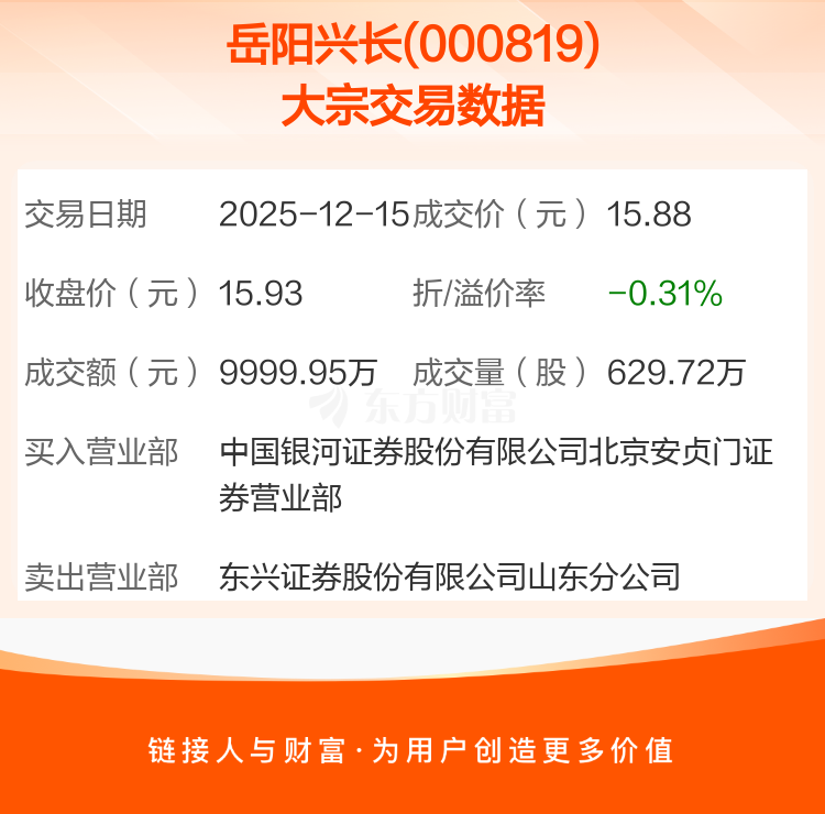大宗交易:岳阳兴长成交9999.95万元,折价0.31%(12-15)