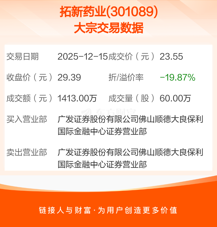 大宗交易:拓新药业成交1413.00万元,折价19.87%(12-15)