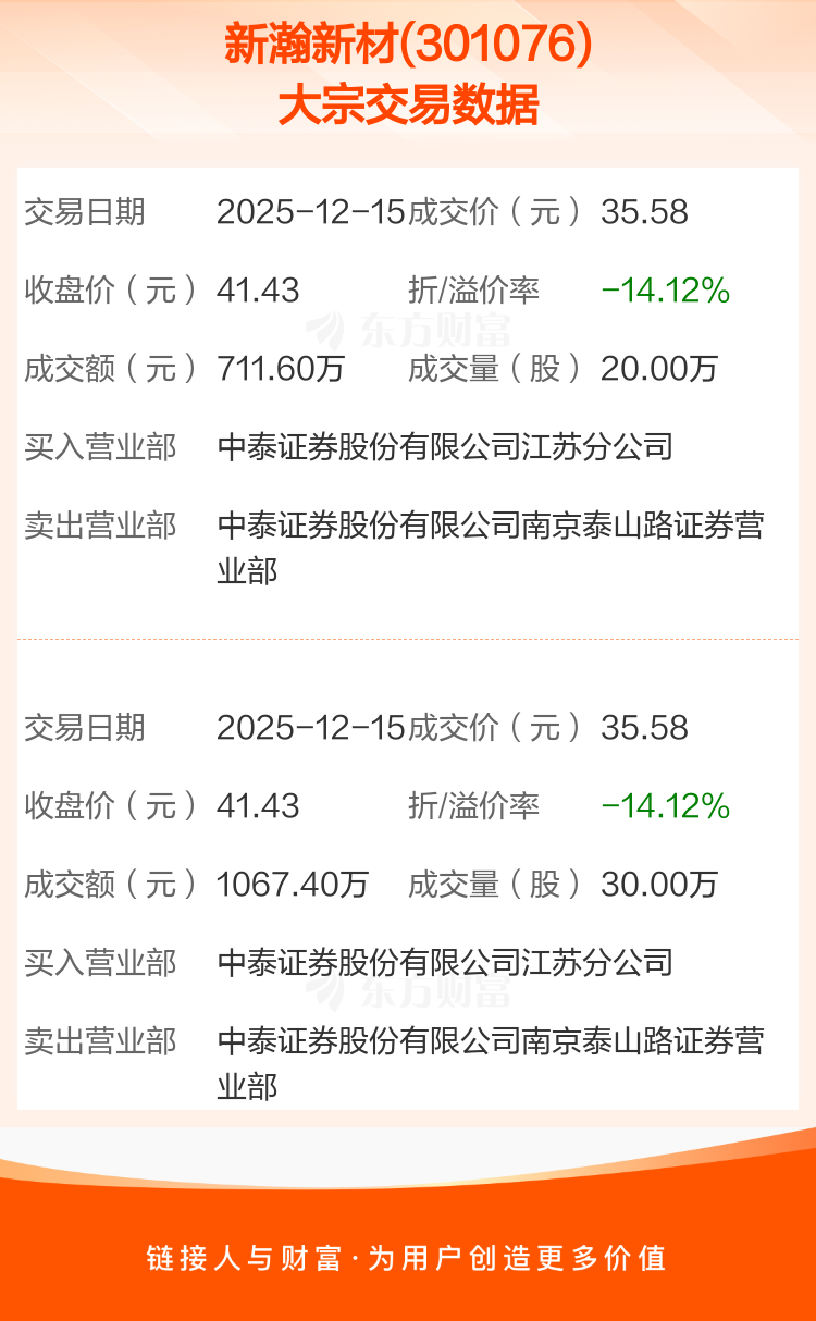 2025年12月15日,新瀚新材发生2笔大宗交易,共成交50.00万股,成交金额1779.00万元,占其流通市值比例为0.39%。