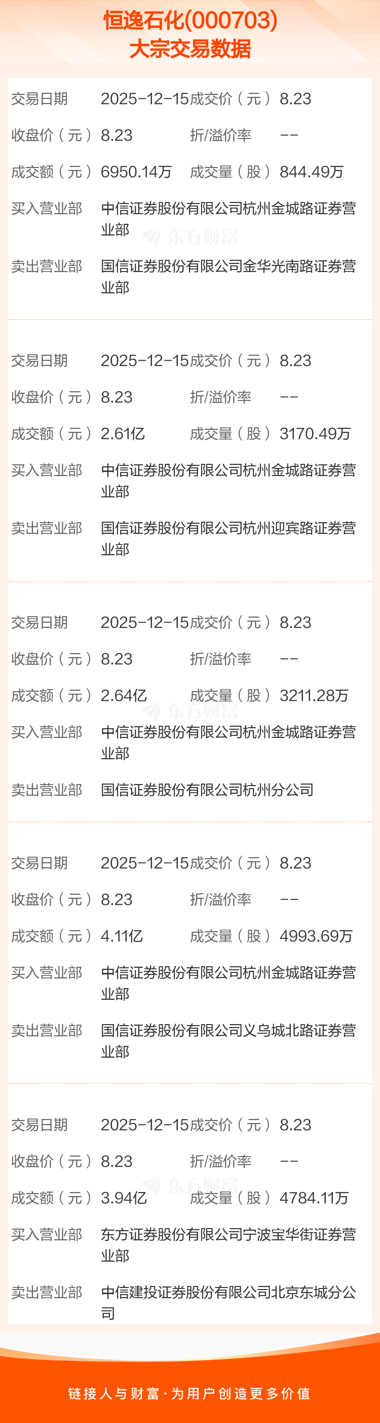 2025年12月15日,恒逸石化发生5笔大宗交易,共成交1.70亿股,成交金额13.99亿元,占其流通市值比例为4.75%。