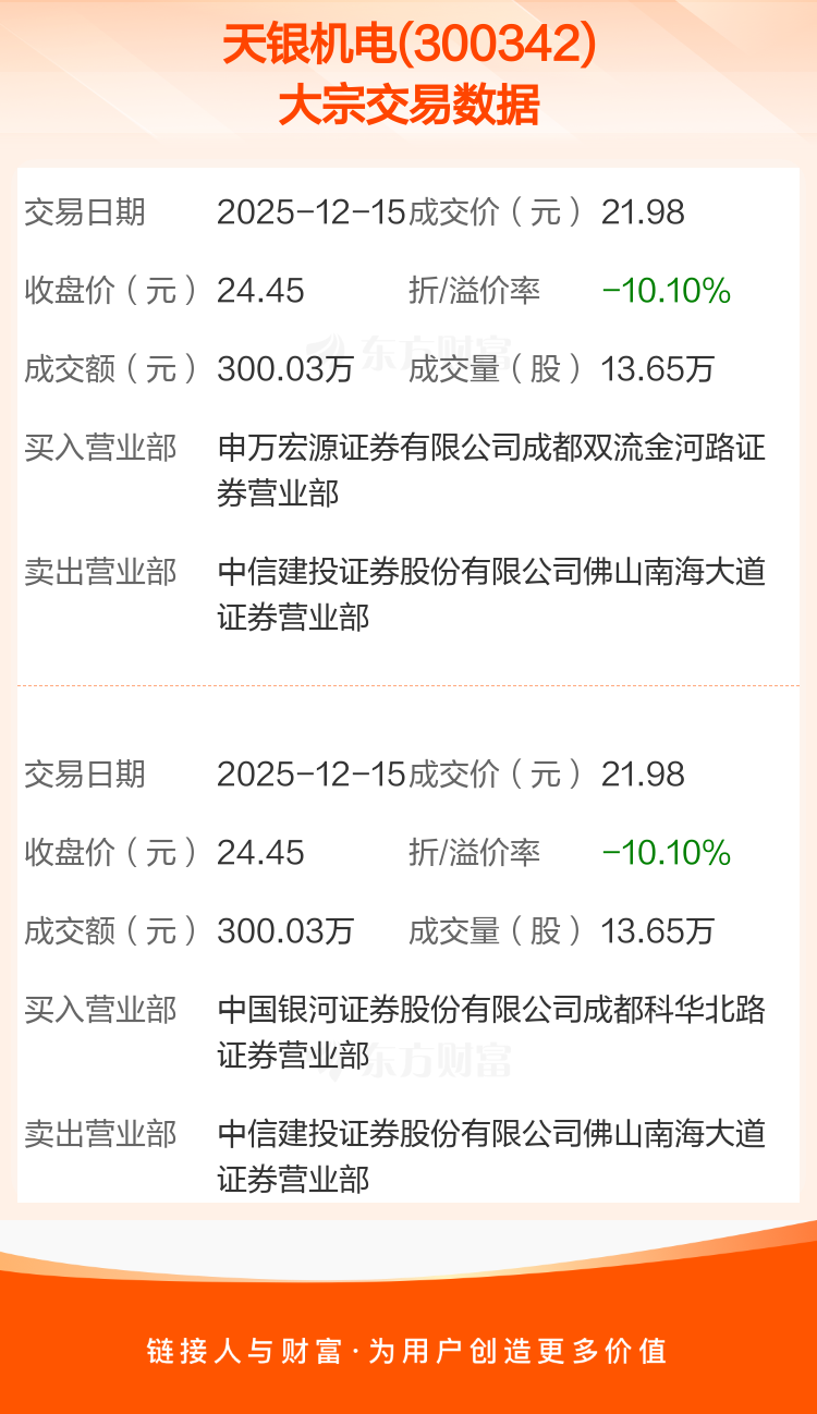 2025年12月15日,天银机电发生2笔大宗交易,共成交27.30万股,成交金额600.06万元,占其流通市值比例为0.06%。