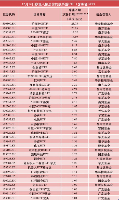 具体来看,12月12日,华泰柏瑞沪深300ETF、南方中证500ETF分别以23.75亿元、20.65亿元的净流入额位居第一、第二,南方中证A500ETF、华泰柏瑞中证A500ETF的单日净流入额则均超10亿元。